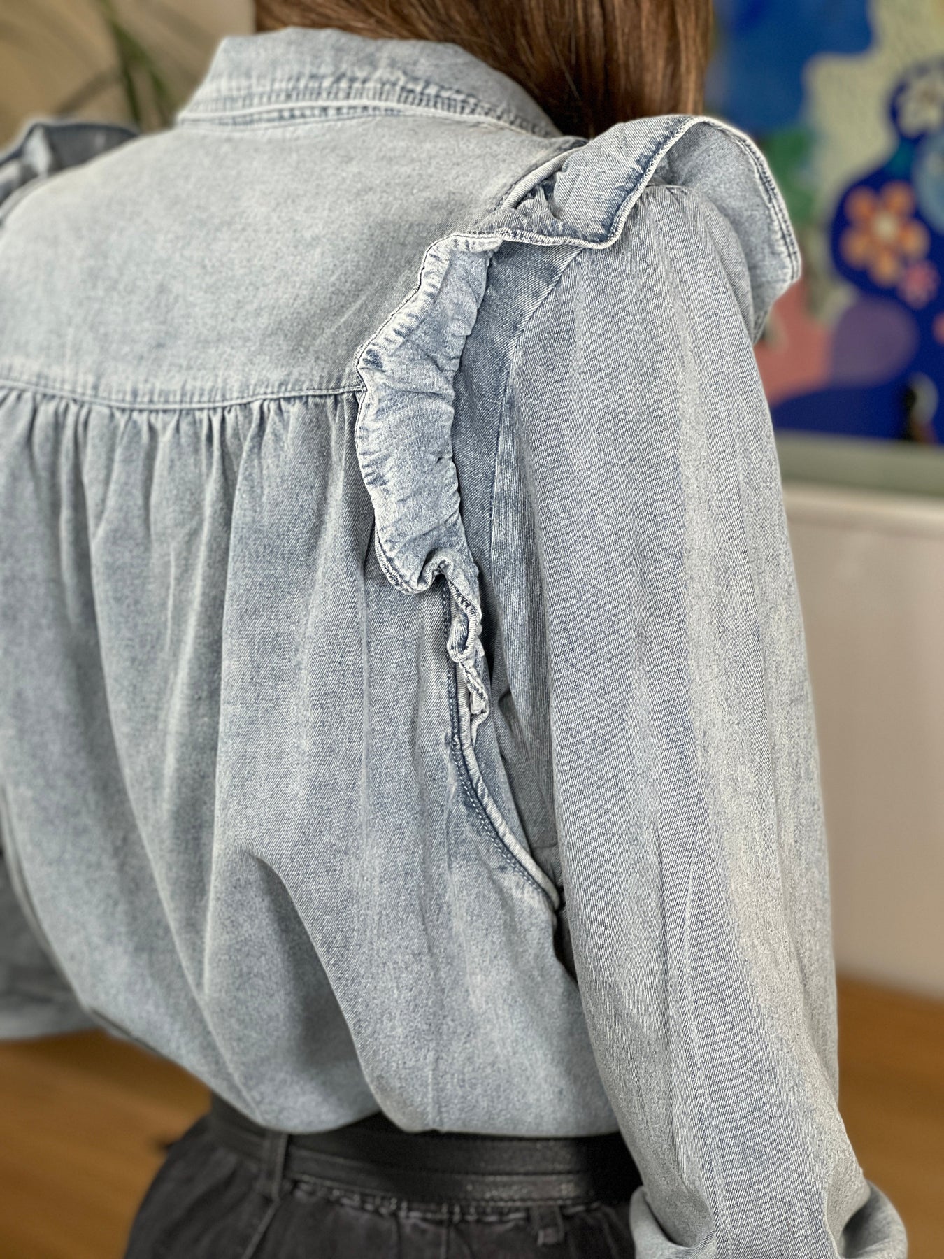 Ses détails à volants délicats soulignent subtilement la silhouette, tandis que son bleu denim délavé apporte une touche intemporelle. Idéale pour toutes celles qui cherchent à conjuguer confort et style au quotidien.